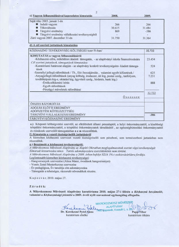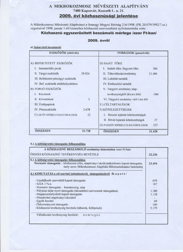 A Mikrokozmosz Művészeti Alapítvány 2009. évi közhasznúsági jelentése